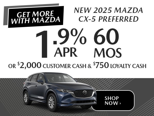 Excludes registration, tax, title, license, insurance & dealer fee. 1.9% APR/60 months based on $17.48/$1000 financed, down payment may be required. Ex STK MT194, MSRP $33,880. $750 Mazda Loyalty for current Mazda customers who purchase or lease a new and unused 2025 MAZDA CX-5. Must present dealer with current registration title, current Mazda sales contract or Mazda Financial Services Agreement and valid driver’s license. Certain restrictions may apply; void where prohibited. $2,000 Customer Cash from Mazda, with approved credit, not all will qualify; may not be available with other offers. Ends 03.31.26.