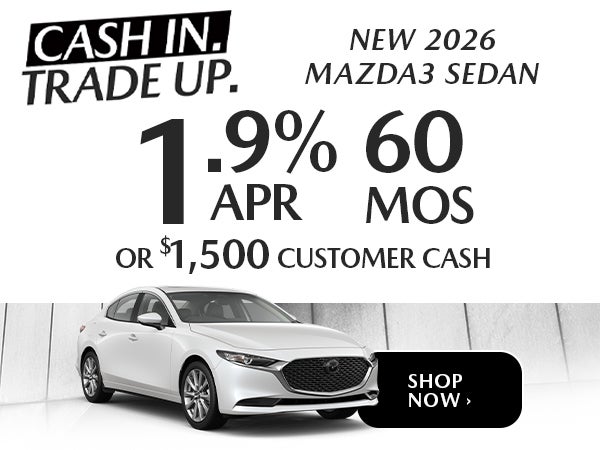 Excludes registration, tax, title, license, insurance & dealer fee. 1.9% APR/60 months based on $17.48/$1000 financed, down payment may be required. Ex STK MC18, MSRP $28,970. $1,500 Customer Cash good towards a new 2026 MAZDA3 SEDAN. Customer Cash is not combinable with Mazda Financial Services (MFS) Special APR or Lease Programs. Ends 03.02.26.